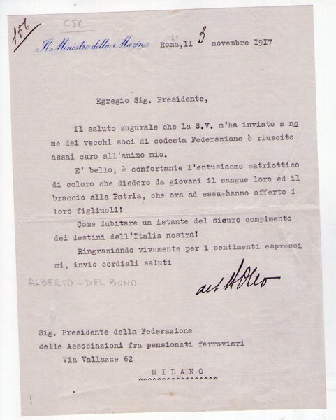 Note: comunicazione firmata di Alberto Del Bono di 1 facciata completa di busta datata 3 Novembre 1917; ottimo es.