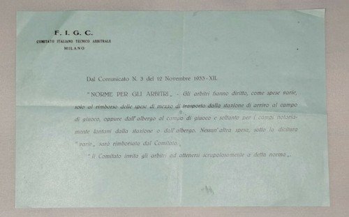 ARBITRI velina originale 1933 fascismo FIGC norme spese da museo documento epoca
