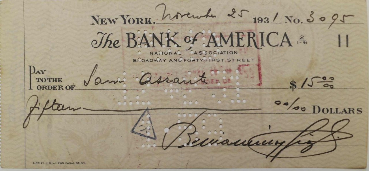 Assegno della Bank of America (mm. 69 x 159) - datato: New York, November 25, 1931 - all'ordine di Sam Assante, per un importo di $ 15, firmato dal celeberrimo tenore italiano Beniamino Gigli.