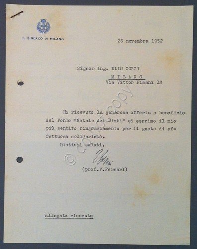 Autografo - Autograph - Virgilio Ferrari - Sindaco Milano - 1952