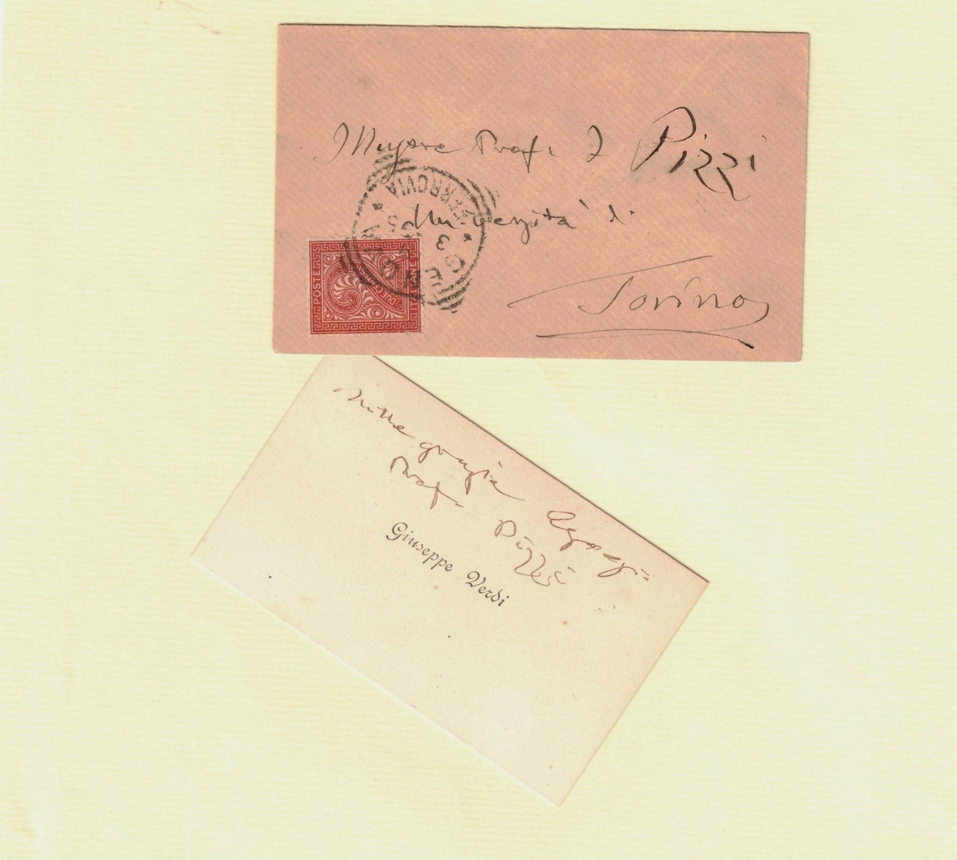 Biglietto da visita intestato a Giuseppe Verdi (mm. 54x89) con la scritta Mille grazie Egregio Professor Pizzi e relativa busta, affrancata e timbrata (Genova), indirizzata a Illustre Prof. Pizzi / Università di Torino.Ben conservato.