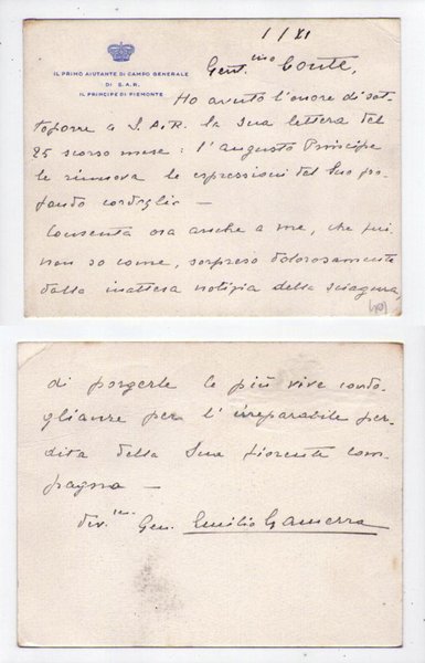 Biglietto manoscritto e firmato Generale EMILIO GAMERRA Primo Aiutante di Campo Generale di S.A.R. Principe di Piemonte