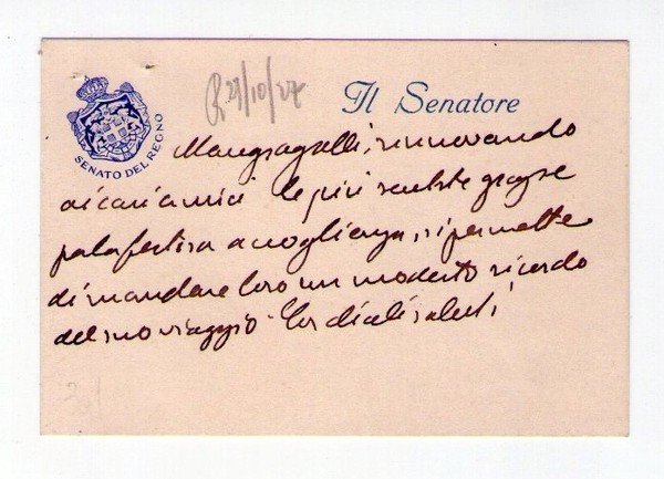 Biglietto manoscritto Il Senatore LUIGI MANGIAGALLI - Senato del Regno