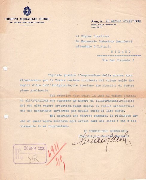 CAROLEI GAETANO. Militare, Medaglia d´Oro al Valor Militare. Invio autografato. 1930