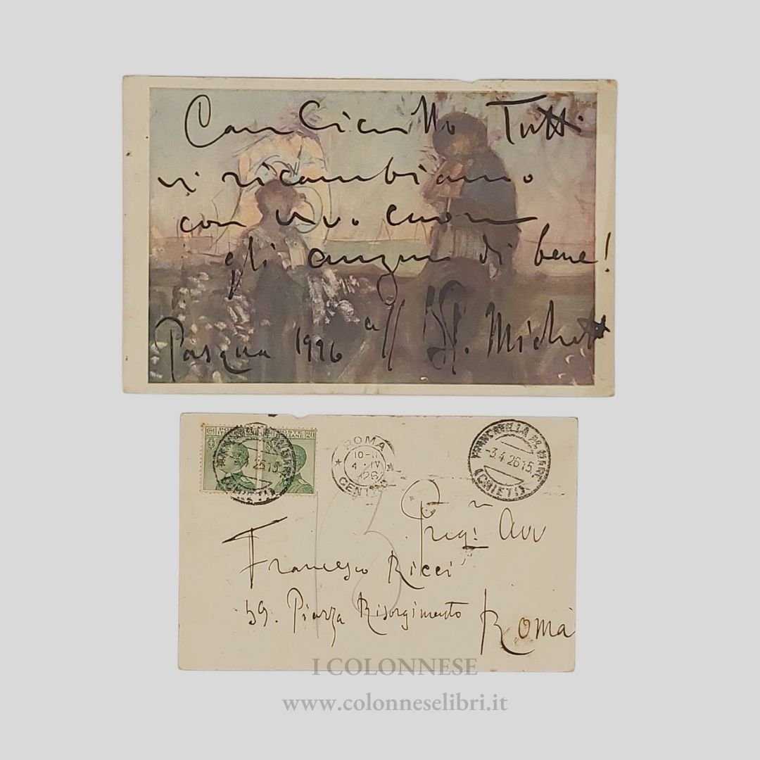 Cartolina illustrata (mm 140×90) manoscritta a inchiostro nero al recto-verso, 4 righi. Viaggiata, doppio francobollo e timbri, postalizzata da Francavilla al Mare il 3/04/1926. Molto rara. «Caro Ciccillo vi ricambiamo gli auguri di bene! Pasqua 1926». Francesco Paolo Michetti (Tocco da Casauria, 2 ottobre 1851 – Francavilla al Mare, 5 marzo 1929) è stato un pittore, fotografo e politico italiano. Si diplomò presso l’Accademia di Belle Arti di Napoli, dove fu allievo, con Edoardo Dalbono, del maestro Domenico Morelli, di cui inizialmente imitò il naturalismo e il realismo visionario: giovane promettente, la sua opera fu subito notata anche da Filippo Palizzi, suo conterraneo, che in quegli anni viveva a Napoli. Michetti ebbe tre figli, tra questi Giorgio diventerà un Asso dell’aviazione italiana durante la Prima Guerra Mondiale. L’Abruzzo rurale, con la sua natura ancora incontaminata, fu sempre la sua fonte di ispirazione principale. Nel 1872 e poi nel 1875 espose le sue opere al Salon di Parigi, raggiunse la definitiva fama internazionale, nel 1877, quando espose a Napoli l’eclatante tela del Corpus Domini (acquistata dall’imperatore Guglielmo II di Germania). Tale dipinto, tra i capolavori più celebri di tutto il panorama ottocentesco italiano. Nel 1888, riferendosi alla geniale e rivoluzionaria opera del Michetti, Gabriele D’Annunzio scrisse: «E il Corpus Domini era per tutti noi, cercatori irrequieti di un’arte nuova, il Verbo dipinto; era, nella nostra chiesa, l’immagine delle immagini».<BR><BR>La sua fama si consolidò con le opere successive: Il Voto (1883, Roma, Galleria Nazionale d’Arte Moderna), ispirata alla festa di san Pantaleone a Miglianico, Lungo il fiume paterno o Il dileggio (1888, Chieti, Museo Palazzo de’ Mayo) e La figlia di Iorio (1895, Pescara, Biblioteca Provinciale). Nel 1898 partecipò alla Esposizione generale italiana. Come molti pittori dell’epoca, fin dal 1871 Michetti si era anche interessato alla fotografia, inizialmente solo come procedimento per lo studio dal vero dei soggetti dei suoi quadri, poi anche come nuovo ed autonomo mezzo espressivo, valendosi anche di interventi grafici diretti sulle stesse matrici fotografiche. Agli inizi del ‘900 attorno a lui si creò il Cenacolo michettiano nel convento di S. Maria di Gesù a Francavilla, a cui partecipavano i maggiori artisti abruzzesi dell’epoca, tra i quali Gabriele d’Annunzio e Francesco Paolo Tosti. Vittorio Emanuele III, nel 1909 lo nominò Senatore del regno.