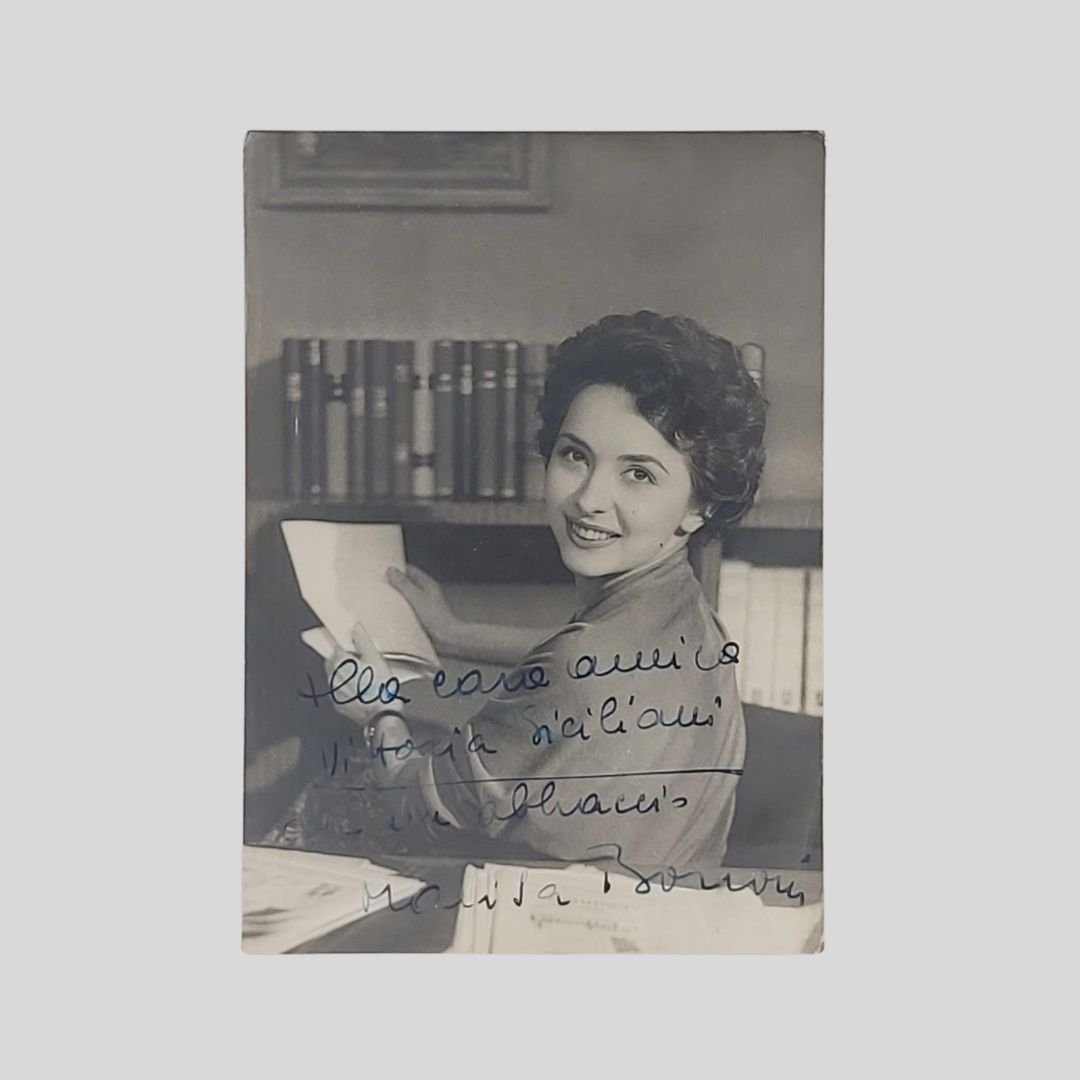 mm 148x105. Al verso invio manoscritto. Lievi tracce d'uso agli angoli.<BR>Marisa Borroni è stata un’annunciatrice e conduttrice televisiva, attiva particolarmente fra gli anni 50 e '60. Assieme a Fulvia Colombo, Maria Teresa Ruta e Nicoletta Orsomando fu fra le prime "Signorine buonasera" della Rai, soprannominata "il musetto delle nove". Come presentatrice televisiva ha condotto, il 31 dicembre 1954, il veglione di Capodanno (primo Capodanno in televisione) assieme a Mike Bongiorno e due edizioni del Festival di Napoli, quella del 1957 e quella del 1960. Fra il 1956 e il 1960 ha avuto anche una breve esperienza come attrice cinematografica.