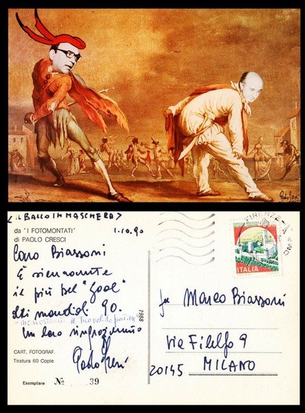 Cartolina fotografica viaggiata di Paolo Cresci I Fotomontati Ballo in maschera. Edizione numerata di 60 esemplari. Con invio e dedica firmata di Paolo Cresci.