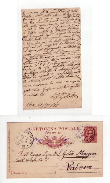 Cartolina manoscritta e firmata Ferdinando Gabotto 1892