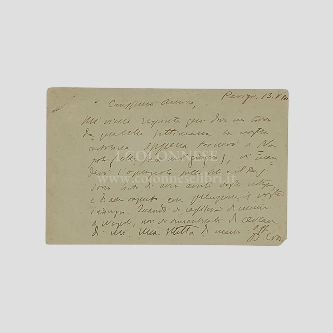 Cartolina postale (mm 140×90) inviata da “Parigi 13/5/1902”, manoscritta a inchiostro marrone, 11 righi oltre la data e la firma. Francobollo e timbro. Tracce d’uso, piccola mancanza all’angolo della firma con perdita della lettera “e”. «Carissimo amico, Mi viene respinta […] la vostra cartolina. Appena tornerò a Napoli (che sarà nel giugno), vi manderò l’opuscolo sullo Sch. e il De S. Sono lieto di avere avuto vostre notizie e di aver saputo con precisione il vostro indirizzo. Quando vi capiterà di venire a Napoli non vi dimenticate di cercar di me. Una stretta di mano»».<BR>[Benedetto Croce si riferisce all’opuscolo: De Sanctis e Schopenhauer. Nota letta all’Accademia Pontaniana nella tornata del 16 marzo 1902 /dal socio Benedetto Croce Napoli,Tessitore e figlio, 1902, pp. 15. Estratto da: Atti dell’Accademia Pontaniana]. Benedetto Croce [Pescasseroli, 1866-Napoli, 1952]. Filosofo idealista, storico, critico ed erudito; direttore de La Critica; in politica, liberale e tenace avversario del fascismo. Fu senatore nel 1910, ministro della pubblica istruzione nel 1920-21. Tornò per un breve periodo alla politica attiva nel 1944. «L’arte, in quanto pura intuizione, è forma di conoscenza autonoma, distinta dalla conoscenza storica e scientifica». Gaetano Amalfi [Piano di Sorrento, 1855-Napoli, 1928). Letterato, magistrato e scrittore. Nel 1888 fu pretore a Pagani, poi a Torre Annunziata e Casproa. Nel 1898 fu nominato sostituto procuratore del Re a Matera, poi ad Avellino, a Salerno, a Nicosia e a Napoli. Nel 1908 fu procuratore generale a Potenza e nel 1909 fu trasferito alla Corte di Cassazione di Napoli dove morì nel 1928. Gli interessi dell’Amalfì erano rivolti principalmente a cinque ben distinti rami della cultura: quello giuridico, quello folcloristico, quello letterario, quello filosofico e quello storico. Scrisse per la rivista Napoli nobilissima i seguenti articoli: Marechiaro (1893), La Madonna dell’Arco (1895), La fossa del coccodrillo in Castelnuovo (1895), Ancora della leggenda di Raimondo di Sangro e dell’autore del suo ritratto (1895), Montevergine (1896).