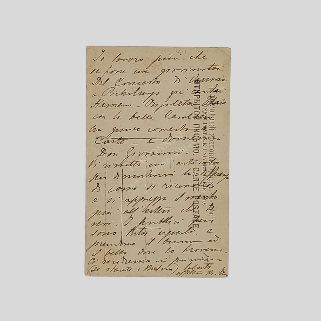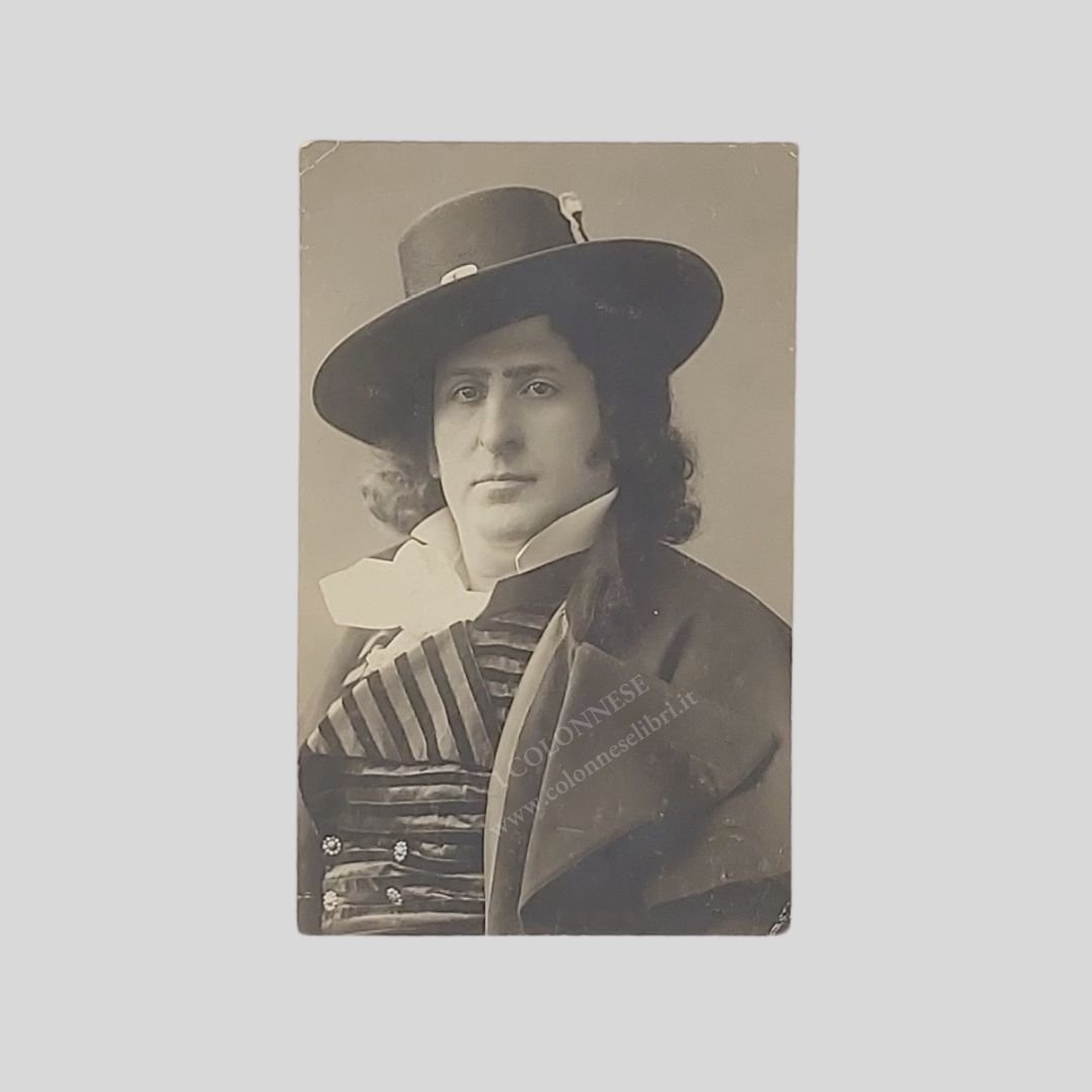 Fotocartolina manoscritta al verso a inchiostro marrone, 20 righi oltre la firma. Undivided back, cm 9×14 ca. di produzione russa, con timbro a secco del fotografo al recto. Pieghe agli angoli, tracce d’uso. «[…] Dal Concerto di Varsavia a Pietroburgo […] Ernani, Rigoletto, Thais, Don Giovanni. […] Vi rimetto un articolo per dimostrarvi la differenza di come si riconosce e si apprezza il merito più all’estero che da noi. I pubblici però sono tutti uguali e prendono l buono e il bello […] Ci rivedremo in primavera (se starete a Milano) Saluti». Mattia Battistini (Roma 1856 – Collebaccaro, Rieti 1928) è stato un baritono italiano di fama internazionale. Ultimo esponente dell’arte italiana del bel canto, fu anche il maggiore baritono del sec. XIX. Il suo repertorio era indiscutibilmente fra i più estesi, comprende circa cento opere e un numero incalcolabile di composizioni da camera. Durò in carriera fino a 70 anni (1927) grazie ad una tecnica considerata prodigiosa e ad una invidiabile intelligenza artistica.