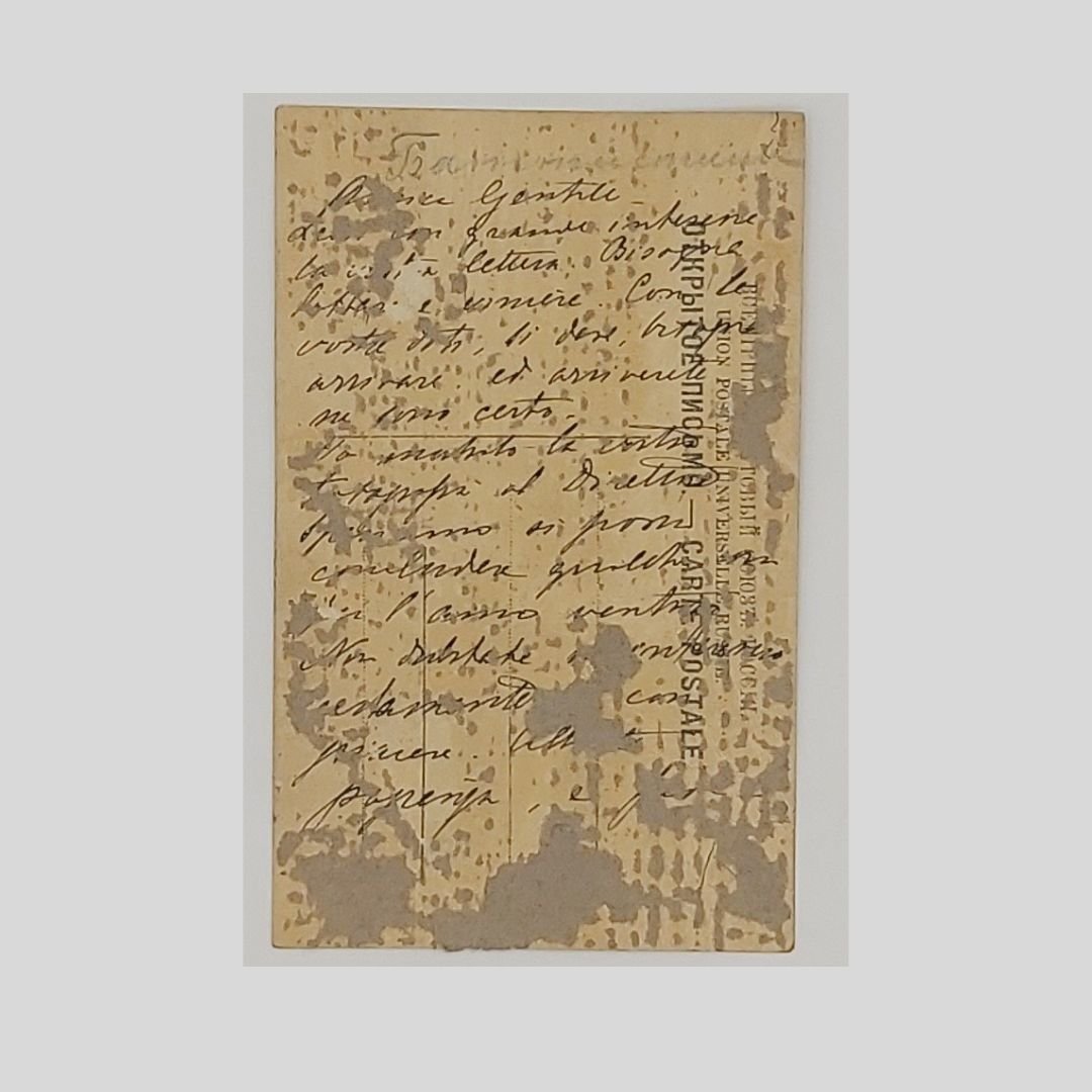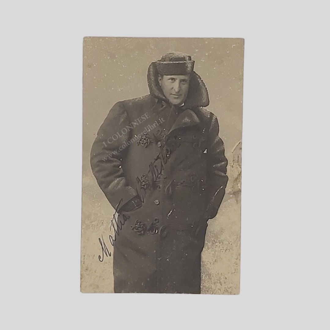 Fotocartolina firmata al recto e manoscritta al verso a inchiostro nero, 16 righi. Undivided back, cm 9×14 ca. di produzione russa, con timbro a secco del fotografo al recto. Tracce d’uso al verso, residui di carta d’album, sovrapposti in parte alla nota autografa, che non consentono una agevole lettura. Amica gentile bisogna lottare e vincere. Con le vostre doti […] arriverete ne sono certo […]». Mattia Battistini (Roma 1856 – Collebaccaro, Rieti 1928) è stato un baritono italiano di fama internazionale. Ultimo esponente dell’arte italiana del bel canto, fu anche il maggiore baritono del sec. XIX. Il suo repertorio era indiscutibilmente fra i più estesi, comprende circa cento opere e un numero incalcolabile di composizioni da camera. Durò in carriera fino a 70 anni (1927) grazie ad una tecnica considerata prodigiosa e ad una invidiabile intelligenza artistica.