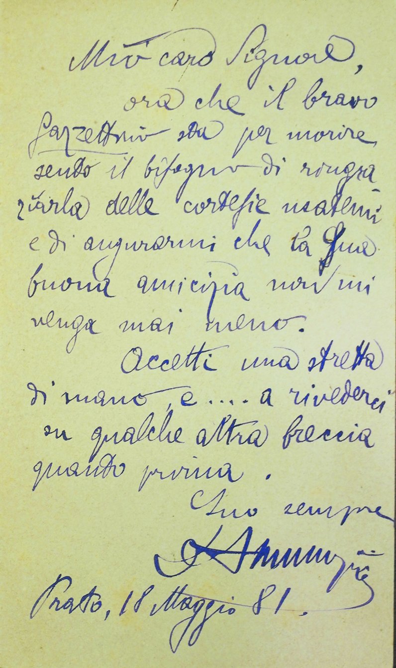 (di mm. 80x138), timbrata Prato Toscana 18.5.81, indirizzata all'Avv. Lino Ferriani (Corso Giovecca, 61. Ferrara), di 15 righe.Mio caro Signore, / ora che il bravo Gazzettino sta per morire sento il bisogno di ringraziarla delle cortesie usatemi e di augurarmi che la Sua buona amicizia non mi venga mai meno. / Accetti una stretta di mano, e .. a rivederci su qualche altra breccia quanto prima. / Suo sempre / D'Annunzio / Prato, 18 maggio 81.L'Avv. Lino Ferriani (1852-1921) fondò a Ferrara La Rivista e poi Il Gazzettino Letterario che ospitò D'Annunzio giovinetto.Si laureò nella sua città natale in Giurisprudenza ed entrò giovanissimo in magistratura; dal 1882 ricoprì l'incarico di procuratore del Re.Esemplare ben conservato.