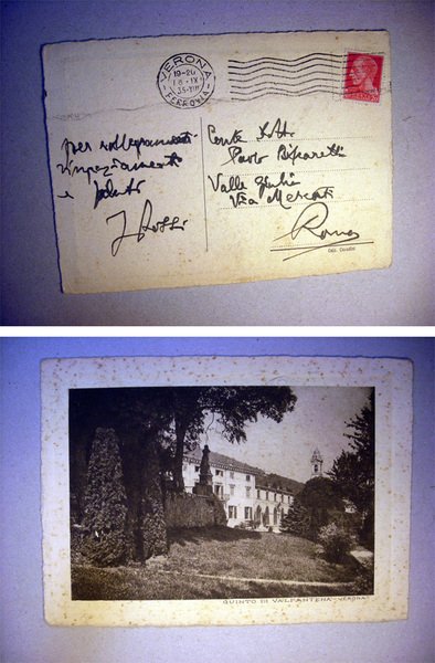 Cartolina "Quinto di Valpantena VERONA" spedita e firmata da Luigi Rossi (politico) al Conte Paolo Biscaretti 1935