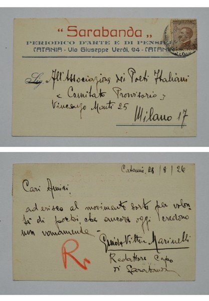 Cartolina SARABANDA Periodico d'Arte e di Pensiero - Catania. Scritta e firmata dal Redattore Capo Guido Vittor Marinelli
