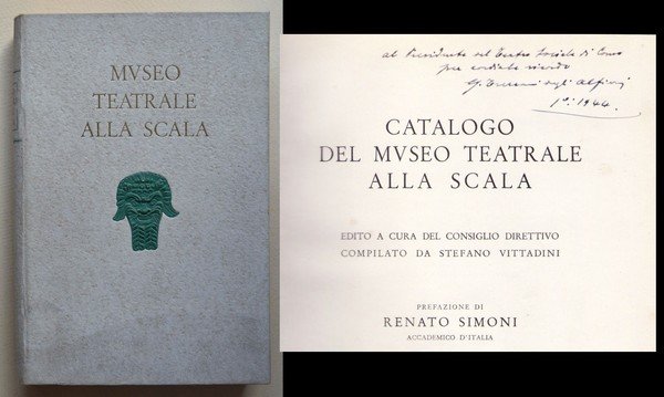 *Catalogo del Museo teatrale alla Scala. Edito a cura del Consiglio DIrettivo compilato da Stefano Vittadini. Prefazione di Renato Simoni Accademico d'Italia. Copia dedicata e firmata da Giovanni Treccani degli Alfieri.