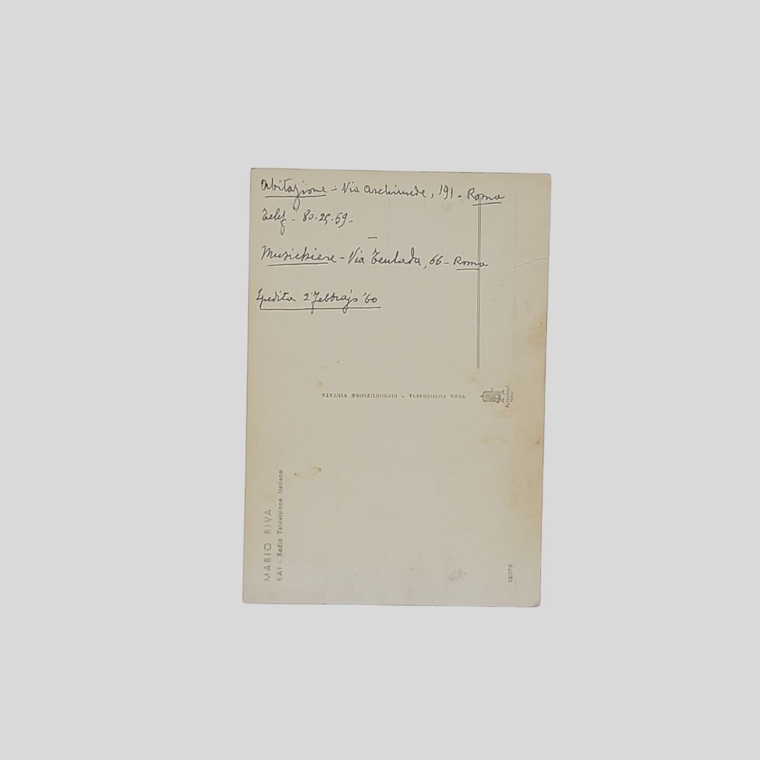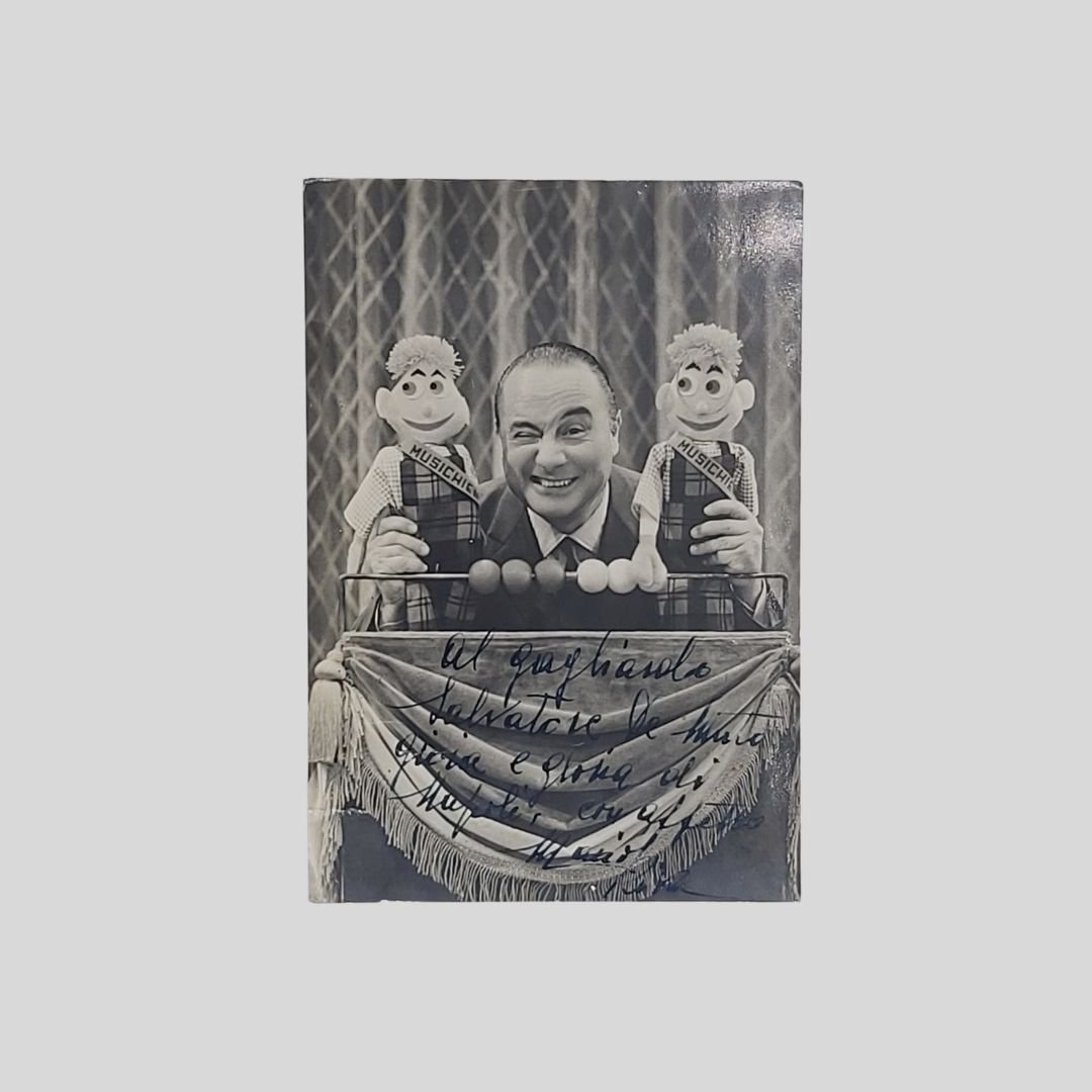 Cartolina fotografica (mm 102×143). Al verso nome a stampa del noto presentatore televisivo e annotazioni a biro del De Muto (l’ultimo Pulcinella) "spedita il 2 febbraio 1960". Una delle ultime dediche del compianto comico e presentatore scomparso nell’agosto dello stesso anno. Tracce d’uso.
