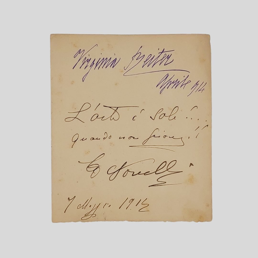 Frammento di pagina (mm 178x152) di "liber amicorum", multifirma,manoscritto a inchiostro marrone, con 2 righi di testo, firmato e datato '7 maggio 1915': «L'arte è sole.quando non piove!». Ermete Novelli [Lucca 1851-Napoli 1919] fu uno dei più apprezzati interpreti teatrali italiani, dapprima nel genere pochadistico e dal 1890, in quello shakespeariano. Nel 1900 fondò in Italia il primo teatro stabile, "Casa Goldoni", presso il Teatro Valle di Roma. In seguito diresse il teatro Sannazaro di Napoli. Scrisse l'autobiografia "Foglietti sparsi narranti la mia vita", opera pubblicato postuma a cura del figlio Enrico.