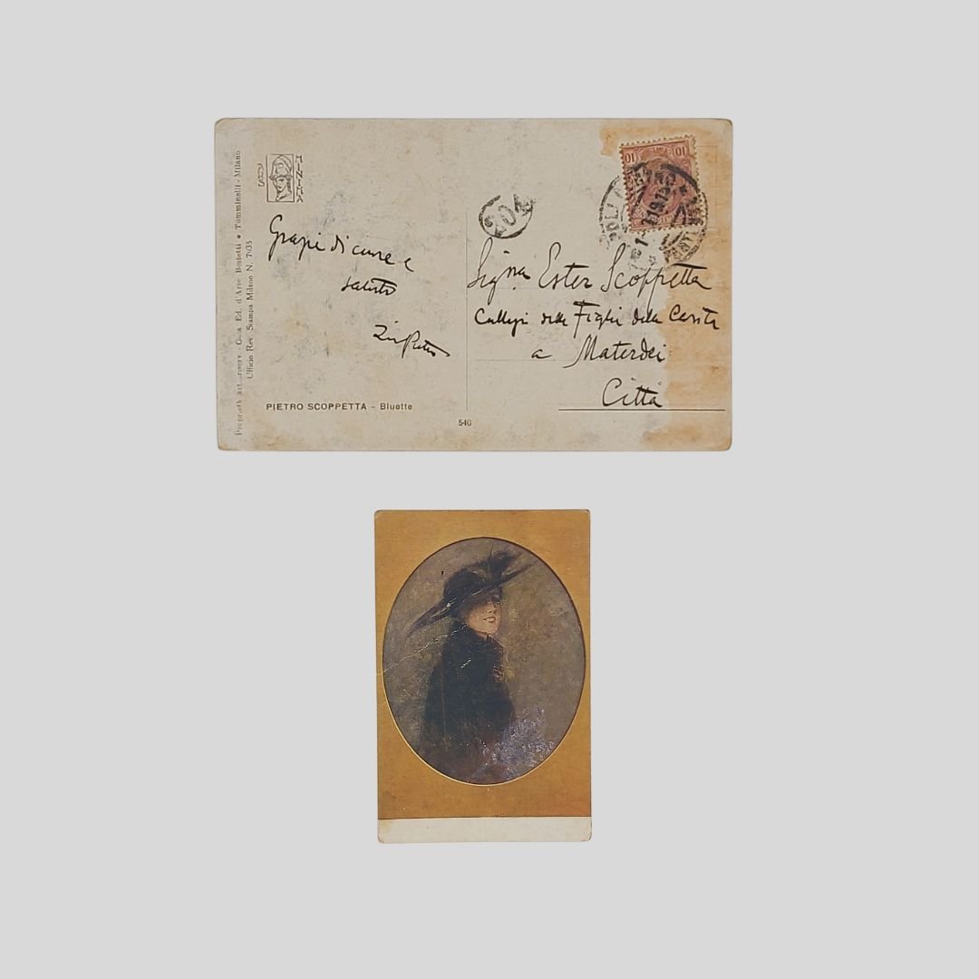 1. Cartolina viaggiata raffigurante l’opera di Pietro Scoppetta Bluette. Milano, Bestetti e Tumminelli, mm 90×14, francobollo e timbro, postalizzata il 1/3/1919 e indirizzata alla nipote Ester Scoppetta, Collegio delle figlie della Carità”, firmata a inchiostro nero “zio Pietro”. Tracce d’uso e incrinatura. 2. Cartolina postale non viaggiata, raffigurante il ritratto di Pietro Scoppetta opera di Edoardo Delbono. Al verso con inchiostro seppia “al Commendatore Achille Macchia in omaggio” segue firma autografa. In buone condizioni. Pietro Scoppetta (Amalfi, 15 febbraio 1863 – Napoli, 10 febbraio 1920) Pittore e illustratore. Dipinse, con pastose gamme cromatiche, ritratti, scene di genere e paesaggi dai toni aneddotici maturando, solo dopo il soggiorno a Parigi (1900-12), lo stile più fluido e immediato che gli diede notorietà. Lavorò anche come illustratore per le riviste La Cronaca partenopea, La tavola rotonda (edizioni Bideri) e Illustrazione Italiana. Visse nella Napoli della Belle Époque, con gli eleganti luoghi di aggregazione culturale quali il café-chantant Salone Margherita e il Caffè Gambrinus, che divennero presto punti di riferimento della vita napoletana. Proprio il Gambrinus gli fornì un’importante occasione di mostrare le proprie capacità, quando nel periodo 1889-1890 fu chiamato ad affrescarne le volte con altri pittori di punta dell’ambiente dell’epoca: Luca Postiglione, Vincenzo Volpe, Edoardo Matania, Attilio Pratella, Giuseppe Casciaro, Vincenzo Migliaro, Vincenzo Irolli… Alla sua morte la Biennale di Venezia del 1920 gli dedicò una sala personale dove furono esposti trentacinque dipinti. Sue opere sono conservate nella Pinacoteca di Capodimonte.
