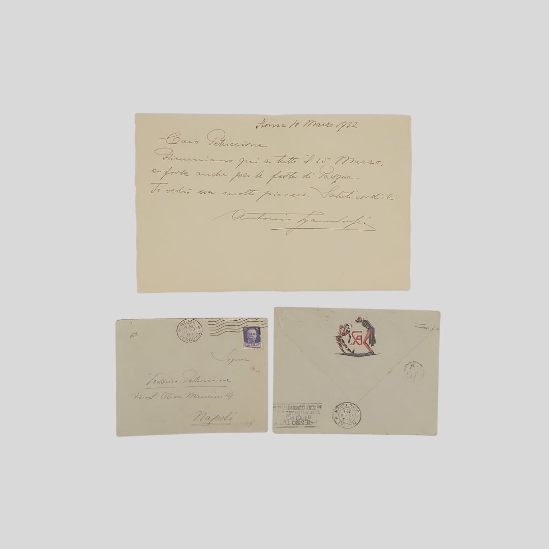 1. ‘Busto [Arsizio], 29 Gennaio 1932'. Manoscritto, con inchiostro nero, al recto-verso di cartoncino (mm 152×98) intestato con il monogramma “AG” e le maschere di Arlecchino e Pantalone, il tutto a rilievo. 15 righi oltre la data e la firma. È presente busta di invio, anch’essa intestata al verso, con francobolli e timbri postali, con tracce d’uso. 2. ‘Roma, 1 marzo 1932’. Manoscritto, con inchiostro nero, su foglio di carta (mm 206×133) ripiegato, 4 righi oltre la data e la firma. Naturale piega, ma in buono stato di conservazione. È presente busta di invio, intestata al verso con il monogramma “AG” e le maschere di Arlecchino e Pantalone, il tutto a rilievo, francobollo e timbri. In buone condizioni. La Compagnia Gandusio-Almirante nella stagione teatrale 1931-32 lanciò Anna Magnani e Rina Morelli che si avvicendavano nelle parti di prima attrice giovane. 1. «Caro Petriccione comprami in gran fretta la commedia di Altavilla, anche per 150 lire! Se a meno non la danno. E vieni a leggermi il lavoro a Roma. Speriamo veramente che tu abbia fatto una cosa carina e di quattrini! Le mie attrici sono: la Lola [Braccini], la [Ada] Dondini, la [Rina] Morelli [in] Ciapini, la [Anna] Magnani […] e tutti cantano: le migliori sono la Lola e la Magnani. Gli uomini: [Luigi] Almirante, Stival, [Gastone] Ciapini, [Paolo] Stoppa, De Cristofaro, Brunetti […] tutti intonati. Mi raccomando Pasquale Altavilla!». 2. «Caro Petriccione, Rimaniamo qui a tutto il 25 Marzo, e forse anche per le feste di Pasqua. Ti vedrò con molto piacere. Saluti cordiali.». Nella stagione teatrale 1931-32 la Compagnia Gandusio-Almirante mise in scena le commedie: L’uomo che ispira fiducia di Armont, Bourrachon di Doillet, Baldassarre di Marchand, Il malandrino di Verneuil. Antonio Gandusio [Rovigno d’Istria 1875-Milano 1951. Attore teatrale e cinematografico. Fu uno dei più interessanti attori comici italiani, quasi una maschera da commedia dell’arte, un patetico burattino con una grande mobilità nel volto, una voce buffamente deformata, il gesticolare a scatti: è l’attore comico per eccellenza del primo Novecento. Passa dalla formazione nella Filodrammatica romana alle compagnie professionali di Alfredo De Sanctis, Ermete Novelli, Virginia Reiter e Teresa Mariani, diventando capocomico nel 1918. Nel 1930 il G. formò compagnia con Dina Galli che, dopo la morte di A. Guasti, non aveva ancora trovato chi potesse sostituirlo degnamente. Non si trattò tuttavia di un incontro fortunato, come notò lo stesso G. nelle sue memorie: “non è tanto facile affiatarsi con la Galli, proclive ad andar a soggetto, a non studiar le parti, a non voler far prove” (Gandusio, Cinquant’anni di palcoscenico, p. 116). Tra le commedie messe in scena in quel periodo ricordiamo La barca dei comici di L. Bonelli, Alla moda di D. Falconi e O. Biancoli, Milioni di A. Fraccaroli, Banca Nemo di L. Verneuil, La rivincita delle mogli di G. Valori. Nell’agosto 1931 il binomio si sciolse. Il G. formò una nuova compagnia (stagione teatrale 1931-32) con Lola Braccini, A. Dondini, Anna Magnani, Rina Morelli, L. Almirante, G. Stival. La neonata Gandusio-Almirante propose un repertorio ricco di novità, tra le quali Bourrachon di L. Doillet e Baldassarre di L. Marchand. La sua attività cinematografica, intrapresa con regolarità dal 1933, divenne progressivamente più intensa, mentre più saltuaria si faceva quella teatrale, e fu segnata dalle stesse caratteristiche interpretative, che gli avevano consentito di affermarsi sul palcoscenico: deformazione grottesca e paradossale da un lato e gusto del patetico dall’altro. Partecipò a una trentina di film di scarso valore artistico. La sua migliore interpretazione cinematografica rimane quella di Bortolo Ciocci in Se non son matti non li vogliamo (1941) di Esodo Pratelli. Nella stagione 1933-34 il G. formò una compagnia scritturando nuovamente Dina Galli. Prima attrice era Laura Carli. Ma a causa dei capricci della Galli – che non si rassegnava a fare le parti della caratterista – la stagione, pur avendo avuto ottime piazze, si concluse assai male, anche finanziariamente. Recitò fino al giorno della sua morte avvenuta il 23 maggio 1951, spaziando tra teatro, radio e cinema e trasmettendo la propria esperienza artistica agli attori della generazione successiva. Con la sua morte scomparve definitivamente dal nostro palcoscenico la figura del “brillante”, ruolo ottocentesco che grazie a lui era sopravvissuto al mutare dei modi, della sensibilità e del gusto. Federico Petriccione [Napoli 1895-Milano 1970]. Giornalista, critico teatrale, drammaturgo. Collaborò a diverse testate tra cui il Roma (1914-22 e 1924-27), Corriere della Sera e la Domenica del Corriere, Battaglie del Mezzogiorno (1922-23), Giorno (1923-1924), Roma della Domenica (1924-27), Tempo. Commedie: La donna mia (Napoli, Teatro Fiorentini, compagnia Palmarini, 31 marzo 1921); Nero (ivi, Teatro Sannazaro, comp. De Sanctis, 30 aprile 1923); Mio cugino Totò (ivi Teatro Fiorentini, comp. Rossi-Ferrero, 9 novembre 1923); La Vita nuova (ivi, T. Mercadante, comp. Falconi, dic. 1926); Un Magnifico cappello (Sanremo, comp. Musco, 15 settembre 1937); Il Grande Leopoldo (Riccione, comp. Carini, 16 agosto 1939); Finisce così… (Milano, Ecxelsior, comp. Ruggeri, 17 marzo 1950). Tra le sue pubblicazioni: Sette storie di vita e di morte (1919), Napoli: calci d’azzurro (1931), La città abbandonata (1955), Piccola storia della canzone napoletana (1960). Pubblicò anche vari libretti ed opuscoli di argomento sportivo (1933-34): Colombari, Vojak, Vincenzi…