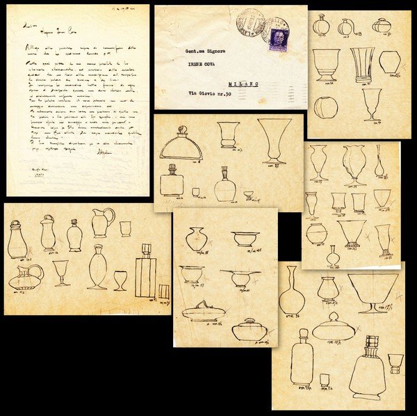 Note: lettera manoscritta e firmata datata 16 Ottobre 1935 e 6 pp. di lucidi con progetti di ceramiche di Ermesto Azzalini (Laveno) inviati a Irene Cova; buon es.