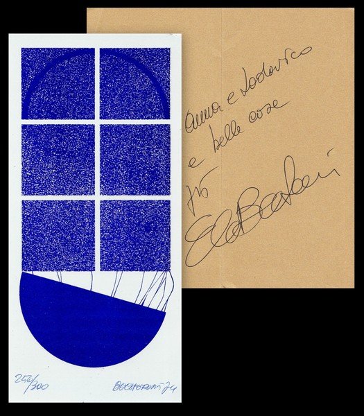 Note: litografia originale firmata e numerata (256 / 300) di Elvio Becheroni formato 10,5X22,4 cm circa inserita in un biglietto di auguri firmato e spedita ai coniugi Castiglione. Buon esemplare.