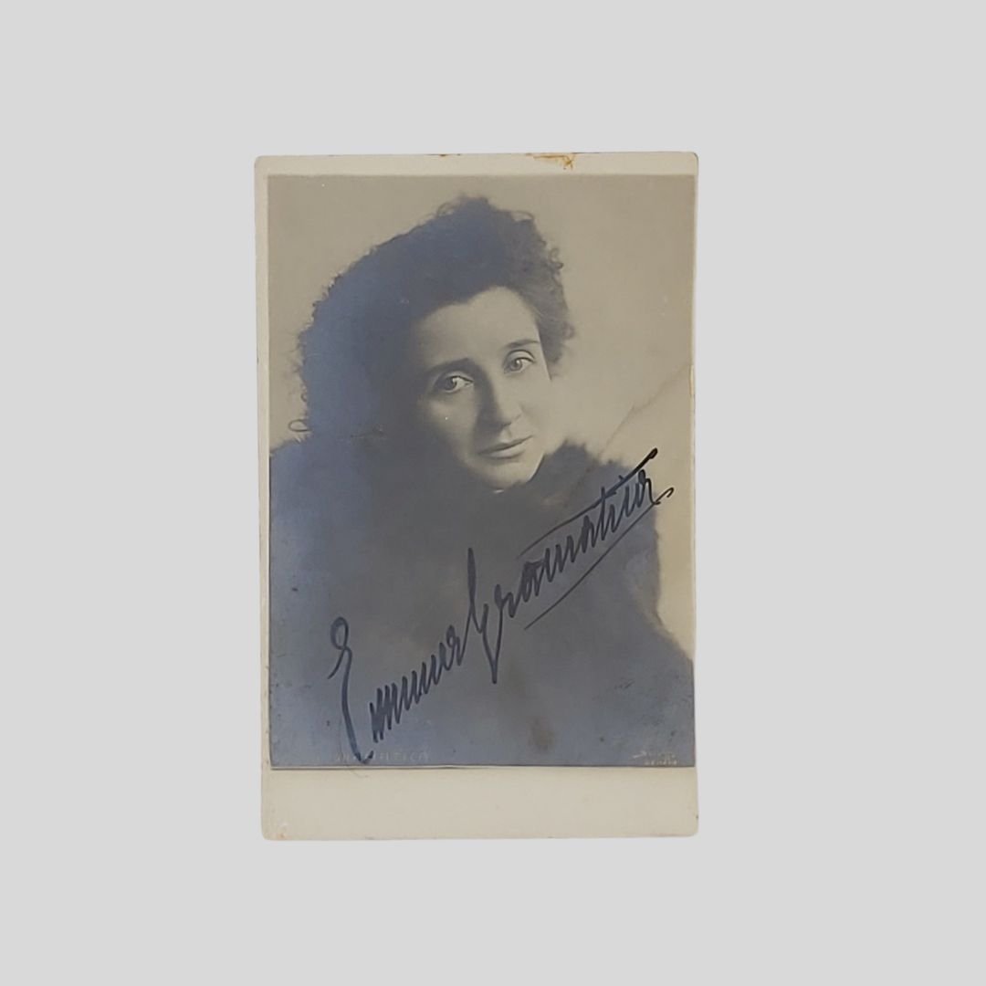 Cartolina fotografica originale dell’epoca non viaggiata (mm 90×140). Nome a stampa al margine inferiore. Lievi tracce d’uso al margine superiore. Emma Gramatica, (pseud. di Aida Laura Argia Gramatica). [Fidenza 1874 – Ostia 1965]. È stata un’attrice italiana. Dotata di un aspetto fisico tutt’altro che appariscente, ma di una carica interpretativa elegantemente incisiva, Emma Gramatica debuttò in teatro ancora adolescente accanto ad Eleonora Duse nella Gioconda di Gabriele D’Annunzio. Emma fu prima attrice nelle compagnie di alcuni dei nomi più prestigiosi del teatro italiano della fine dell’Ottocento e del primo Novecento, come Ermete Zacconi, Flavio Andò, Enrico Reinach ed Ermete Novelli. Negli anni dieci del Novecento forma la famosa compagnia Gramatica-Carini-Piperno, nella quale si formeranno molti grandi attori come Renzo Ricci e Lola Braccini.