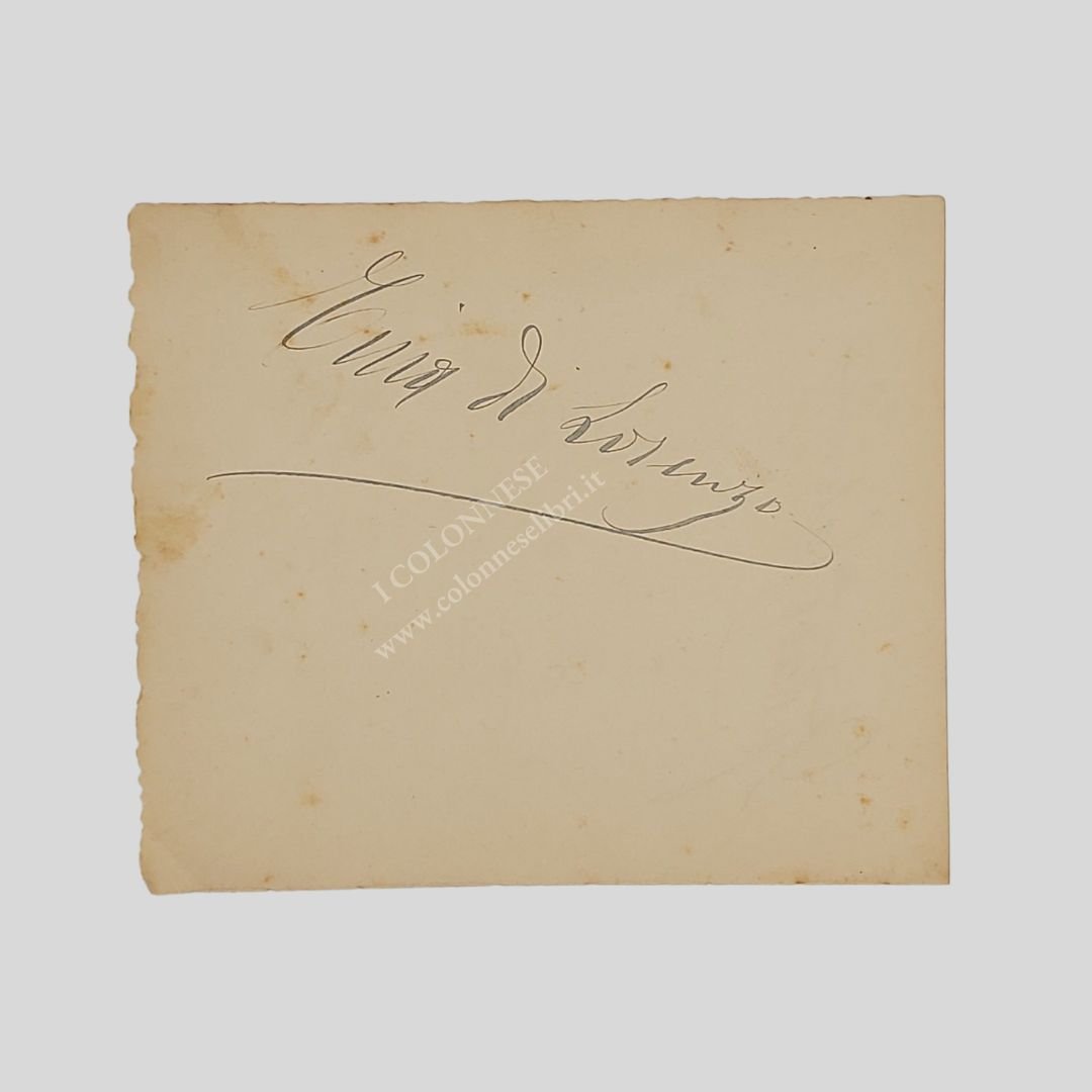 Frammento di pagina (mm 177×150) multifirma di “liber amicorum” manoscritto a inchiostro grigio “carta da zucchero”. Al verso firma autografa di Gustavo Salvini “20/1/1914” e di Leo Orlandini “marzo 1914”, entrambe a inchiostro marrone. Tina Di Lorenzo, pseudonimo di Concettina Di Lorenzo [Torino 1872 – Milano 1930), è stata un’attrice teatrale italiana. A 13 anni, formatasi nelle arti drammatiche a Napoli, intraprese la carriera di attrice con il nome d’arte di Tina Di Lorenzo. Il successo le arrise nel 1888, al Teatro Rossini di Napoli, nel corso della rappresentazione del Ruit hora di Francesco Proto, duca di Maddaloni, dopo la quale la stampa decantò le sue grandi doti di attrice. Possedeva una rara bellezza, voce melodiosa e modi da gran signora nonostante la giovane età: si meritò da parte dei suoi adoratori il soprannome di “Angelicata”. Fu consacrata come astro nascente dell’arte drammatica ed in breve divenne una delle attrici più ricercate e contese dalle compagnie primari. Svolse numerose tournée all’estero, soprattutto nell’America Latina. Grazie al suo talento e alla sua bellezza, in Argentina fu soprannominata Encantadora. Nel 1901 sposò il cugino Armando Falconi, attore anche lui, ebbero un figlio Dino. Tina Di Lorenzo fece parte di numerose compagnie, dallo Stabile del Teatro Manzoni di Milano (dal 1912 al 1914) dove fu primadonna, alla compagnia di Francesco Pasta e Enrico Reinach a quella di Flavio Andò, mietendo una straordinaria e ininterrotta serie di successi. Partecipò ad una sola pellicola cinematografica, sempre assieme al marito, nel 1915: si trattava de La scintilla di Eleuterio Rodolfi. Si ritirò a vita privata negli anni tra il 1918 ed il 1920, tornando in scena una sola volta, nel 1926, al teatro Drammatico Nazionale di Roma. Morì prematuramente a Milano nel 1930. Gustavo Salvini [Livorno 1859 – Marina di Pisa 1930] è stato un attore italiano di cinema e teatro. Figlio d’arte – era nato dall’attore Tommaso Salvini e dall’attrice Clementina Cazzola – prese giovanissimo la via del palcoscenico recitando anche a fianco del padre e divenendo a sua volta un attore di grande livello. Si fece apprezzare per la modernità della sua recitazione e fu un aperto fautore del teatro all’aperto. Fu capocomico di una prestigiosa Compagnia che ebbe, nel 1905-1906, tra le sue attrici una giovanissima Paola Pezzaglia, con la quale si spinse in tournée fino in Egitto. Si cimentò con i grandi classici (Sofocle, Shakespeare, Alfieri). Fu attivo anche nel cinema, prendendo parte ad alcune pellicole come Il romanzo di un giovane povero di Amleto Palermi del 1920 e La bottega dell’antiquario di Mario Corsi del 1921. Nel 1906 a Ravenna entrò nella “loggia massonica Dante Alighieri” per divenire successivamente Maestro nella “loggia Centrale” di Palermo. Fratello dello scultore e direttore della gipsoteca di Firenze, Mario Salvini. Fu padre dell’attore e direttore del doppiaggio Sandro Salvini, nonché zio del regista Guido Salvini. Leo Orlandini, stimato attore teatrale. Recitò con Virgilio Talli, Emma e Irma Gramatica, Oreste Calabresi, Vittorio Zampieri, Ruggero Ruggeri. Fece Compagnia con Tina Bondi, con Eleonora Duse e con Bella Starace.