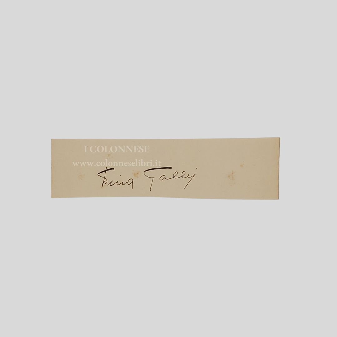 Frammento di carta (mm 152×39), manoscritto a inchiostro nero, s.d. (primi ‘900). Galli Dina, pseudonimo di Clotilde Annamaria Galli [Milano 1877-Roma 1951] Attrice teatrale e cinematografica di grande successo, attiva dagli anni ’10 agli anni ’40. È ricordata per aver recitato con attori di vaglia, fra cui Nino Besozzi e Lucio Ridenti. Nella sua compagnia teatrale, che aveva fondato con Amerigo Guasti suo compagno in vita, lavora insieme a Nunzio Filogamo, Marcella Rovena, Antonio Gandusio ed Evi Maltagliati. Come attrice cinematografica interpreta diversi film, il più conosciuto dei quali è Felicita Colombo, del 1937, tratto da un soggetto di Giuseppe Adami, dove è diretta da Mario Mattoli. A questo film fa seguito l’anno successivo Nonna Felicita, sempre con la regia di Mattoli e sempre su soggetto di Adami. <BR>
