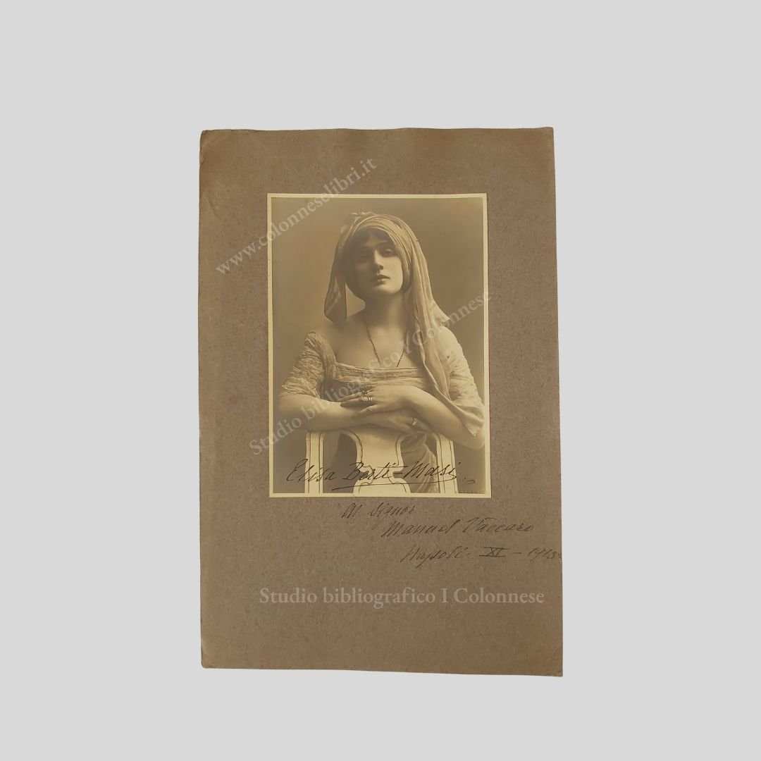 Fotografia originale, di grande formato, ai sali d’argento, virata seppia, mm 230×167. Montata su cartoncino leggero, mm 407×267. Al margine inferiore della foto timbro a secco «Natale Luci – Arezzo». Dedica e firma manoscritti con inchiostro nero. Insignificanti tracce d’uso ai margini del supporto, in buone condizioni. La data in calce alla dedica storicizza la presenza a Napoli di Elisa Berti con la “Compagnia Grandi Spettacoli” diretta da Gualtiero Tumiati, con primattrice Teresina Mariani. In quel periodo la compagnia portava in tournée il Teatro futurista sintetico. Elisa Berti Masi, protagonista della pièce di Filippo Tommaso Marinetti Elettricità, in un intenso e raro ritratto fotografico di Natale Luci. Rara fotografia.