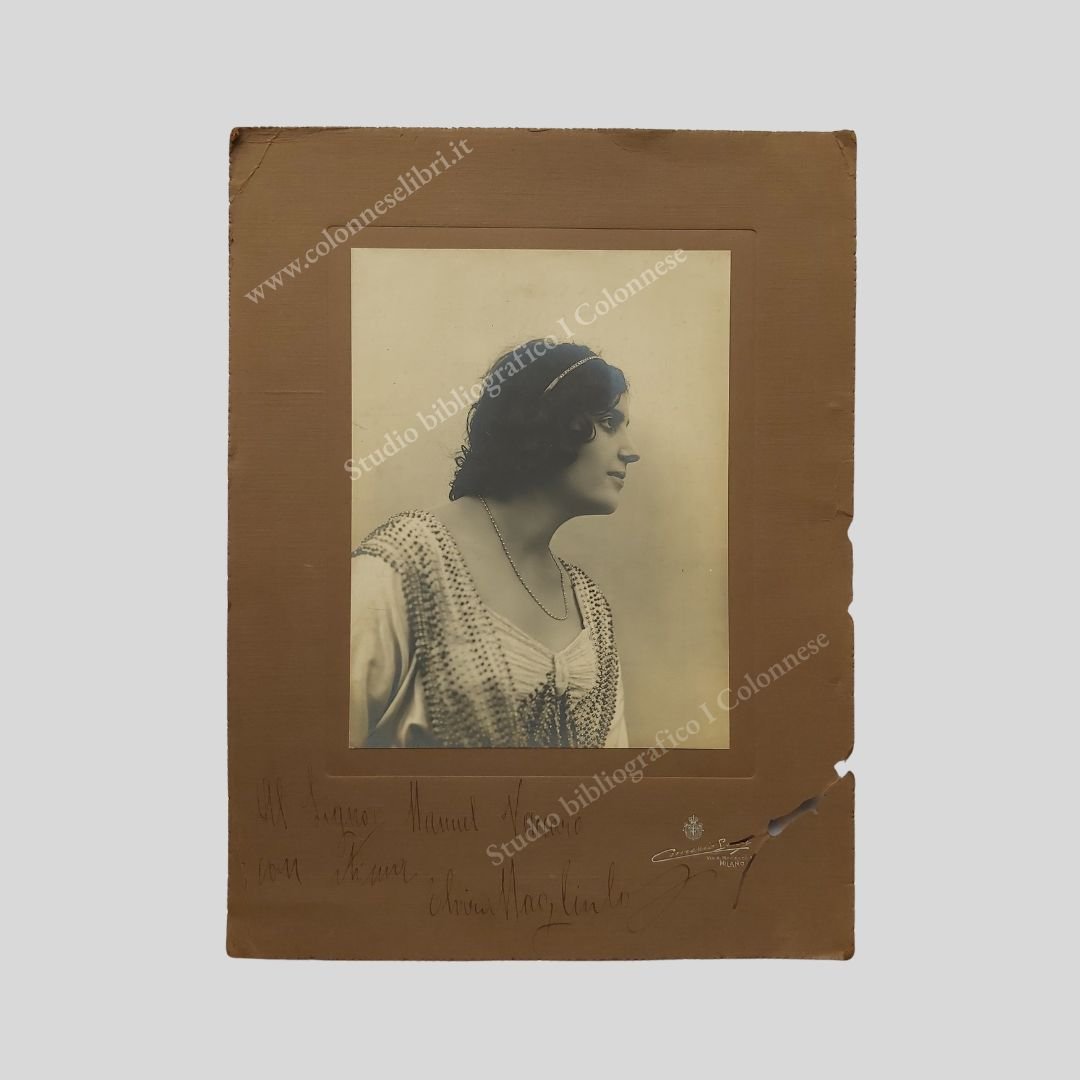 Fotografia originale, di grande formato, ai sali d’argento, virata seppia, mm 246×187. Montata su cartoncino morbido marrone, mm 405×305 . Al recto è presente il marchio del fotografo: «Luca Comerio, via Manzoni 10, Milano». Dedica e firma manoscritti con inchiostro marrone. Tracce d’uso al supporto, con piccole mancanze, anche parzialmente al marchio del fotografo, dovute a passaggio di tarme, ma fotografia in buono stato. Molto rara. La dedica probabilmente risale al 1911, precisamente il 10 aprile 1911, quando la Magliulo si esibì al Teatro San Carlo, interpretando “Carmela” nell’opera «Mese Mariano» tratto dal dramma dialettale del 1900 «’O mese mariano” di Salvatore Di Giacomo, su libretto dello stesso (del cast facevano parte anche Elisa Petri, Superiora e Arturo Roboli, Don Fabiano). Nello stesso anno Elvira Magliulo si esibì sempre al San Carlo nell’Ernani.