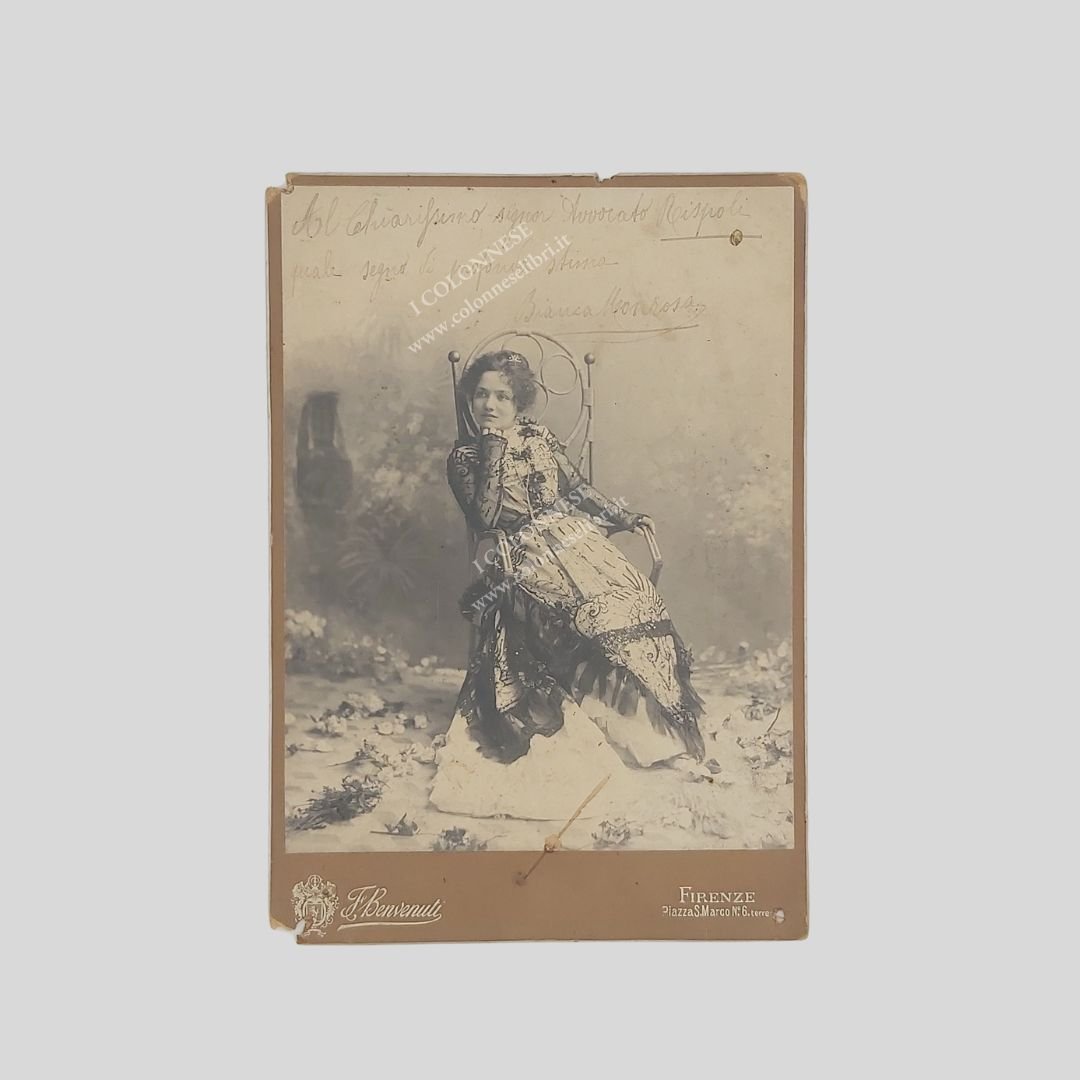 Fotografia all'albumina mm 215×165, montata su cartone, mm 246×174 (supporto). Al recto-verso è presente il marchio del fotografo: «Stabilimento Artistico Fotografico F. Benvenuti Firenze, Piazza S. Marco n.6». Con tracce d'uso e mancanze agli angoli. Rara e ricercata. L'attrice è circondata da petali di rose. Giulia Cornacchi, in arte Bianca Monrosa, scomparve prematuramente nel 1919. Attiva con la propria “Compagnia Bianca Monrosa”, diretta inizalmente dal marito, l’attore Luigi Lambertini e successivamente da Angelo Pezzaglia [Angiolone], si ricordano alcune messe in scena al Politeama Ciscutti di Pola «Madame sans-Genè di Vittoriano Sardou; La zia di Carlo di Brandon Thomas, Effe-Effe e La Dame de Chez-Maxime (Quella del ristorante) di Feydeau».