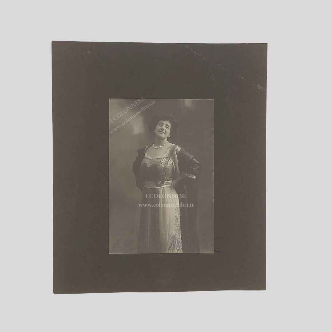 Fotografia originale ai sali d’argento, montata su supporto in cartoncino marrone, mm 163×113(fotografia), mm 262×224 (supporto). Eccetto lievi tracce d’uso al supporto fotografia in buone condizioni. Rara. Virginia Reiter (all’anagrafe Reiterer) [Modena 1862-ivi 1937]. Figura di primo piano del teatro italiano tra Ottocento e Novecento Esordì con la compagnia drammatica di Giovanni Emanuel nel 1886. Nel 1893, scritturata come prima attrice nella compagnia Virgilio Talli – Enrico Reinach, ebbe l’occasione di confrontarsi, accanto al consueto repertorio, anche con alcune pochades francesi che confermarono un’identità attoriale duttile e versatile anche nel genere comico e brillante. Nel 1895, fu prima attrice nella compagnia Flavio Andò – Claudio Leigheb, primo attor giovane Luigi Carini, con il quale l’attrice iniziò allora un lungo sodalizio: La lupa di Giovanni Verga (prima assoluta), Casa paterna di Hermann Sudermann, L’infedele di Roberto Bracco. Dal 1900 al 1903 fu socia di Francesco Pasta. Con Carini fu protagonista nel 1900 di Madame Sans-Gêne di Victorien Sardou ed Émile Moreau a Napoli, che resterà una delle specialità dell’attrice, accanto a un repertorio in larga misura francese già da lei frequentato, ma che comprendeva anche I mariti di Achille Torelli, Messalina di Pietro Cossa, La fine dell’amore di Bracco. Dal 1903 al 1906 Virginia Reiter fece compagnia a sé, affidando però la direzione a Giuseppe Pietriboni, con Luigi Carini come primo attore e con Ugo Piperno e Antonio Gandusio. Nel 1915 si trasferì a Firenze. Dopo alcuni periodi di pausa nel 1920 si ritirò definitivamente dalle scene con una tournée di 100 giorni. Nel 1925 si trasferì a Modena. Attrice dotata di esuberanti talenti naturali (una voce estesa, duttile e un po’ metallica, il volto di una plasticità e di una mobilità capaci di realizzare sorprendenti metamorfosi, un fisico non perfetto, ma florido e potente nella sua forza seduttiva), Virginia Reiter si inserì, in modo personale ma senza violente rotture, all’interno della tradizione del teatro italiano di fine Ottocento.