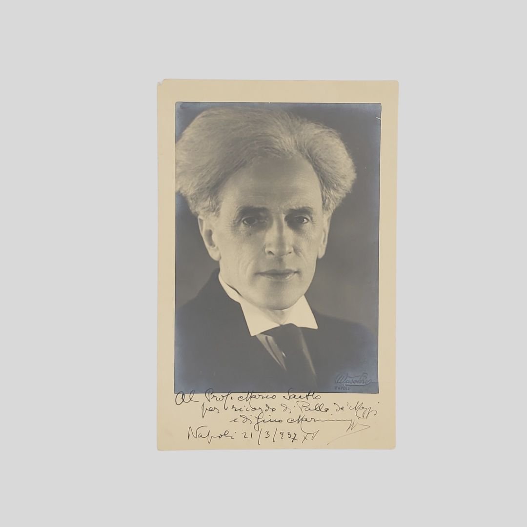 Espressivo ritratto fotografico del direttore d’orchestra e compositore palermitano con dedica e firma autografa, datato ‘Napoli 21/3/937 XV’. Fotografia originale su carta satinata (mm 157×235). Timbro a secco al recto, e a inchiostro al verso, dello studio fotografico ‘Waschke-Napoli’.<BR>Palla de’ Mozzi è la sua seconda opera messa in scena nel 1932, Teatro alla Scala di Milano (nel 1937 al Teatro San Carlo di Napoli).Le incisioni discografiche rimaste di Marinuzzi direttore sono pochissime, perché gran parte delle matrici si trovavano su un treno che venne bombardato durante la guerra. Cfr. Paolo Isotta, Altri canti di Marte, Venezia, Marsilio 2015.