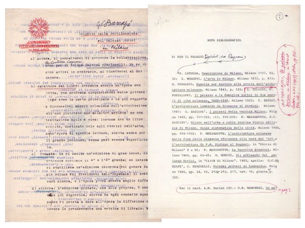 Note: Lotto comprendente il testo originale definitivo del suddetto volume di 36,(4); 1 comunicazione firmata da Bascapè al Consiglio Istituti Ospitalieri di Milano con dei consigli per la pubblicazione; 1 depliant del Meseo Aeronautico Caproni; 2 pp. di appunti manoscritti del Bascapè.