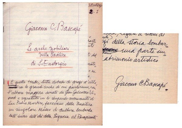 19 pp. di appunti manoscritti e firmati all'ultima pag. da Bascapè sulla Basilica di S. Eustorgio a Milano.