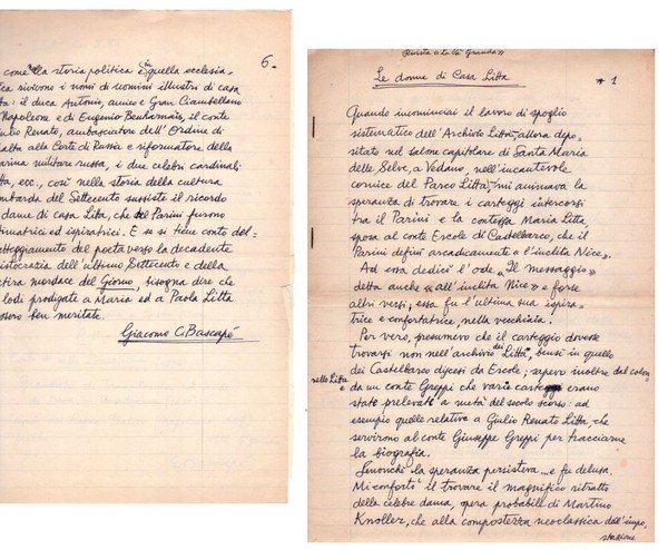 7 pp. manoscritte e firmate due volte da Bascapè per un articolo apparso sulla rivista "La Ca Granda".