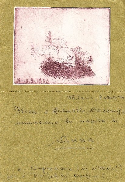 Giancarlo Cazzaniga. Acquaforte originale su biglietto di auguri per la nascita della figlia.