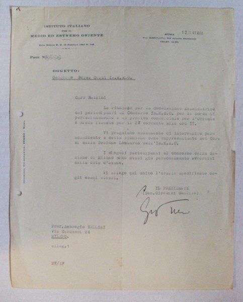 Note: comunicazione firmata di Giovanni Gentile datata 12 Novembre 1941 su carta intestata "Istituto Italiano per il Medio ed Estremo Oriente"; buon es.