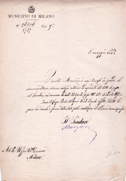 lettera manoscritta e firmata di Giulio Belinzaghi di 1 facciata datata 8 giugno 1890 su carta intestata "Municipio di Milano"; buon es.piccoli strappi laterali.