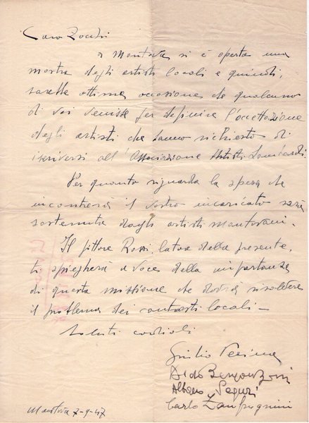 lettera manoscritta e firmata dei pittori Giulio Pessina, Aldo Bergonzoni, Albano Seguri, Carlo Zanfrognini in cui invitano Carlo Zocchi ad una mostra a Mantova; lettere di 1 facciata datata Mantova 7, Settembre 1947; buon es.