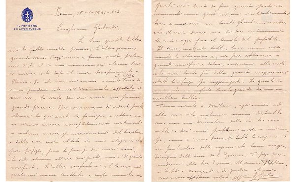 Lettera intestata Il Ministro dei lavori Pubblici. Manoscritta e firmata. Roma 1941