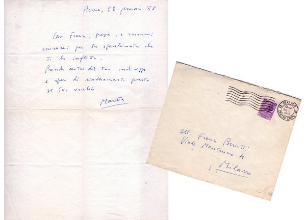 Giuseppe Marotta. Scrittore e sceneggiatore italiano. Lettera manoscritta e firmata + busta. Spedita a Franco Berutti.