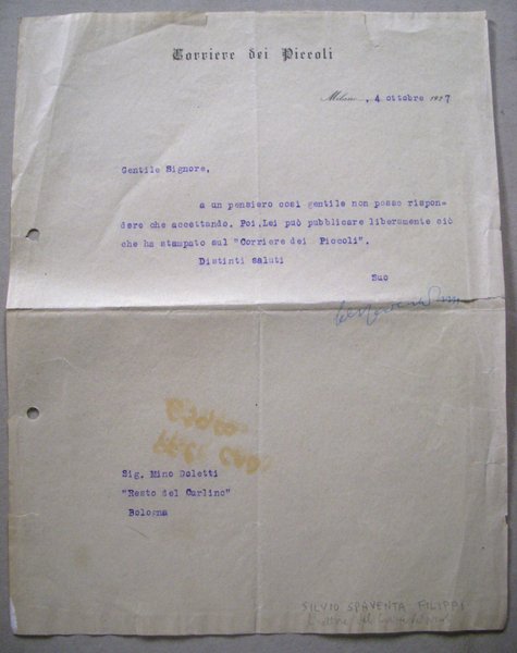 Invio su carta intestata "Corriere dei Piccoli" firmata Silvio Spaventa Filippi. Milano 1927