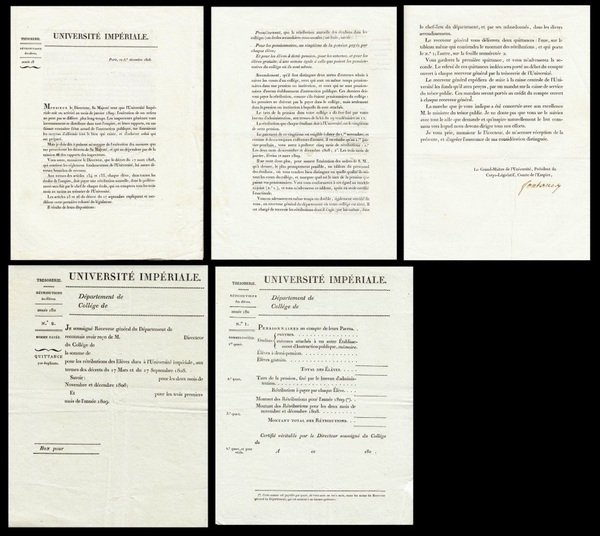 Note: autografo di Jean Pierre Louis de Fontanes su una domanda di iscrizione originale dell'Universitè Imperiale del 10 dicembre 1808 (fondata il 17 marzo 1808 da Napoleone); la domanda è composta da un depliant di 4 pp. con un testo firmato da de Fontanes e da due schede vuote da compilarsi per l'iscrizione; ottimi ess.