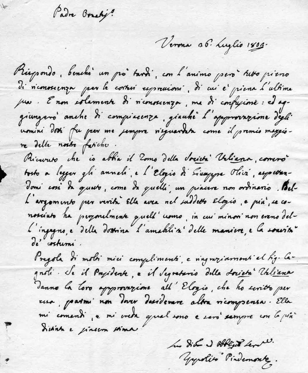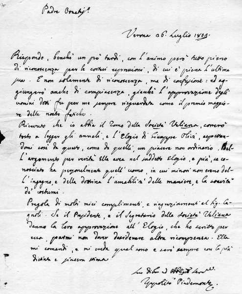Rispondo, benchè un po' tardi, con l'animo però tutto pieno di riconoscenza per le cortesi espressioni, di cui è piena l'ultima sua. E non solamente di riconoscenza, ma di confusione: ed aggiungerò anche di compiacenza, giacchè l'approvazione degli uomini dotti fu per me sempre riguardata come il premio maggiore delle mie fatiche. / Ricevuto che io abbia il Tomo della Società Italiana, correrò tosto a leggere gli annali e l'Elogio di Giuseppe Olivi, aspettandomi così da questo, come da quelli un piacere non ordinario... Se il Presidente e il Segretario della Società Italiana danno la loro approvazione all'Elogio, che ho scritto per essi, parmi non dover desiderare altra ricompensa...Solo picc. mancanza sul secondo foglio bianco, altrimenti ben conservata.