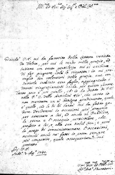 Giacchè V.E. mi ha favorito della lettera venuta da Tolosa, per cui le rendo mille grazie, ed insieme con tanta gentilezza mi si esibisce di far giungere colà la risposta: io mi prevaglio ben volentieri delle grazie sue.. Tanto poco è poi quello, ch'io ho detto di V.E. nella P. ll delle Antichità Estensi, che certo io non meritava un sì benigno gradimento.. Desidererei io occasioni più proprie per attestare a Lei, ed anche al Pubblico, la stima e l'ossequio particolare che io professo a lei, e alla sua Nobil Casa...Con fioriture, altrimenti ben conservata."Letterato e grande storico, autore dei "Rerum Italicarum Scriptores" e degli "Annali della storia d'Italia", è soprattutto nelle "Antiquitates italicae medii aevi" che egli dà la misura della sua grandezza di storico".