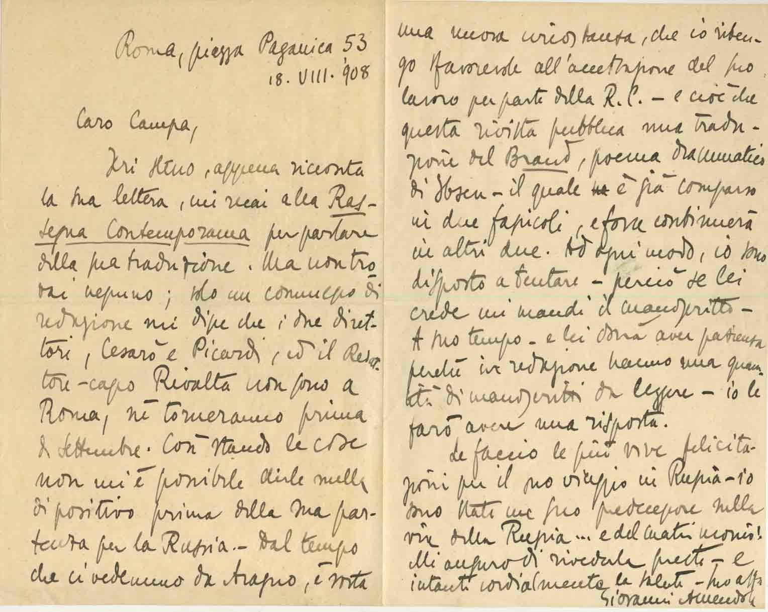Caro Campa, ieri stesso, appena ricevuta la sua lettera mi recai alla Rassegna Contemporanea' per parlare della sua traduzione. Ma non trovai nessuno.. i due direttori.. non sono a Roma, nè torneranno prima di settembre. Stando così le cose non mi è possibile dirle nulla di positivo prima della sua partenza per la Russia. Dal tempo che ci vedemmo da Aragno, è nata una nuova circostanza, che io ritengo favorevole all'accettazione del suo lavoro per parte della R.C. - e cioè che questa rivista pubblica una traduzione del Brand', poema drammatico di Ibsen - il quale è già comparso in due fascioli.. Ad ogni modo io sono diposto a tentare - perciò se lei crede mi mandi il manoscritto.. io le farò avere una risposta. Le faccio le più vive felicitazioni per il suo viaggio in Russia - io sono stato un suo predecessore sulla via della Russia.. e del matrimonio! Mi auguro di rivederla presto...<br> Ben conservata.