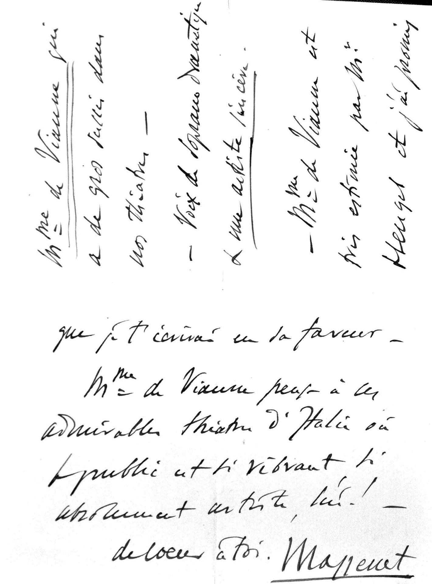 Cher ami cher, tu feras grand plaisir à ton vieil ami Massenet en t'interessant à un artiste de vrai talent, M.me de Vianne qui a de gros succès dans nos theatres - Voix de soprano dramatique & une artiste sincère - M.me de Vianne est très estimée par M. Hengel et j'ai promis que je t'écrivais en sa faveur - M.me de Vianne pense à ses admirables theatres d'Italie où le public est si vibrant, si absolument artiste, lui! .. voeux à toi.Ben conservata.