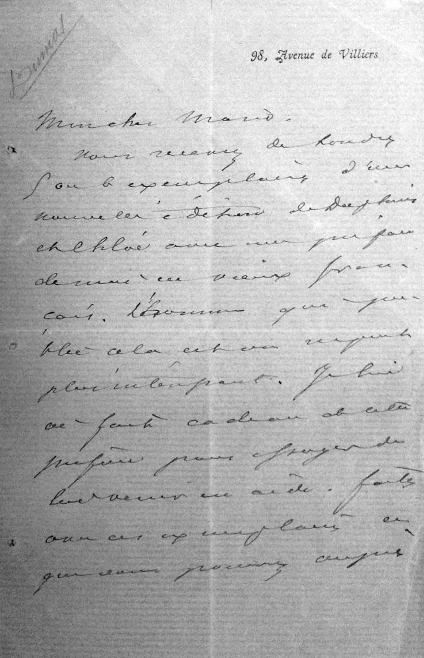 LETTERA AUTOGRAFA FIRMATA. - 3 pp. (mm. 208x134), senza data, su carta azzurrina con l'indirizzo a stampa 98, Avenue de Villier, diretta a Mon cher Mario, di 33 righe.