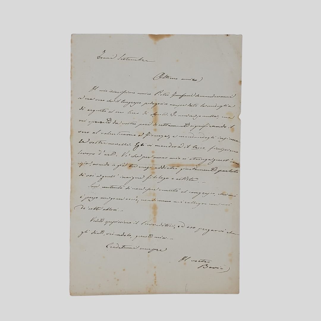 oglio (mm 214×140), manoscritto con inchiostro nero, 17 righi oltre la firma. Nella lettera chiede a un amico di poter verificare se l’amico Pietro Fanfani fosse stato insignito con la medaglia d’argento del Congresso Pedagogico [svoltosi a Napoli dal 18 al 30 settembre 1870] per il suo romanzo “Cecco d’Ascoli”. Tracce di foxing. «Ottimo amico, Il mio chiarissimo amico Pietro Fanfani domandavami se era vero che il Congresso pedagogico avesse dato la medaglia d’argento al suo Cecco di Ascoli¹. Io non ne so nulla, ma voi appurate da vostro pari direttamente significando il vero al valentuomo di Firenze, e mandandogli insieme le vostre novelle. Egli vi manderà il “Cecco” finissimo lavoro d’arte. Vo’ che per amor mio si stringa quest’amicizia, avendo io già tre mesi addietro giustamente parlato di voi a quell’insigne filologo e artista. Son contento di non esser venuto al congresso, che mi è parso un gran vocìo; nondimeno mi rallegro con voi de’ vostri allori. Vedete prestissimo il Provveditore, ed oso pregarvi che gli diate, vedendolo, questa mia. credetemi sempre Il vostro Bovio». ¹Cecco d’Ascoli, Racconto storico del sec. XIV, Firenze, Tip. di G. Carnasecchi, 1870. Giovanni Bovio [Trani 1837 – Napoli 1903] Filosofo, drammaturgo, uomo politico (repubblicano e anticlericale). Prof. a Napoli di filosofia del diritto, fu il filosofo della democrazia repubblicana e negli Scritti filosofici e politici (1883) e nella Dottrina dei partiti in Europa (1886) chiarì il programma di una “repubblica sociale”, fondata sull’assoluta libertà di pensiero. Eletto deputato nel 1876, redasse nel 1897 il programma del gruppo repubblicano, di cui fece sempre parte. Padre di Libero (Napoli 1833-1942) poeta e commediografo dialettale. Pietro Fanfani [Collesalvetti 1815 – Firenze 1879] Filologo, dal 1859, bibliotecario della Marucelliana. Editore di testi antichi, autore di studî di lingua e di libri educativi, polemista in difesa della tradizione linguistica quale egli puristicamente la concepiva; e soprattutto, lessicografo (Vocabolario della lingua italiana, 1855; Vocabolario dell’uso toscano, 1863; Vocabolario della pronunzia toscana, 1863; Vocabolario italiano, in collab. con G. Rigutini, 1875; Lessico dell’infima e corrotta italianità, in collab. con C. Arlia, 1877; ecc.).